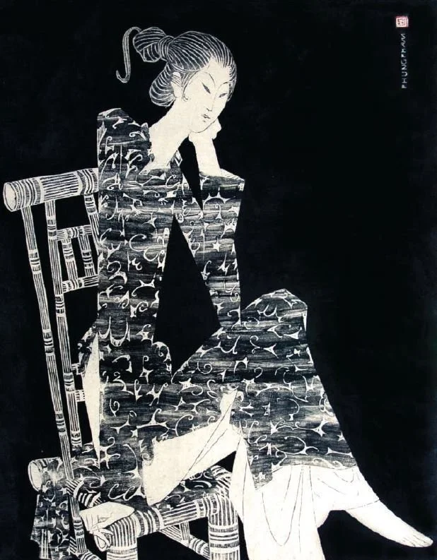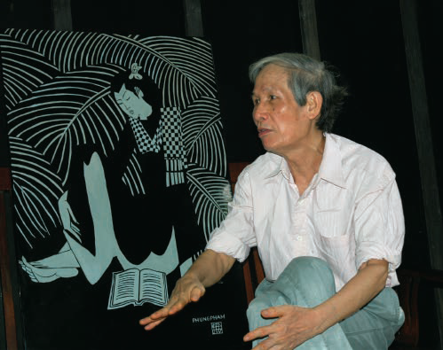 DECADES AGO, I came across an intriguing black and white woodblock image in the Vietnam National Fine Arts Museum, but it would be many years before I finally met Phung Pham, a quiet, intense man with an overwhelming need for creative expression. He is now in his ninetieth year. This article is largely based on interviews held in 2006 at his family residence in Hanoi, Vietnam, supplemented by information from public interviews of the artist at recent exhibitions. The works illustrated were either photographed at the artist’s residence or are from collectors, who purchased directly from the artist. Others are from a 2023 retrospective of the artist’s work exhibited at Thang Long Art Gallery in Hanoi.