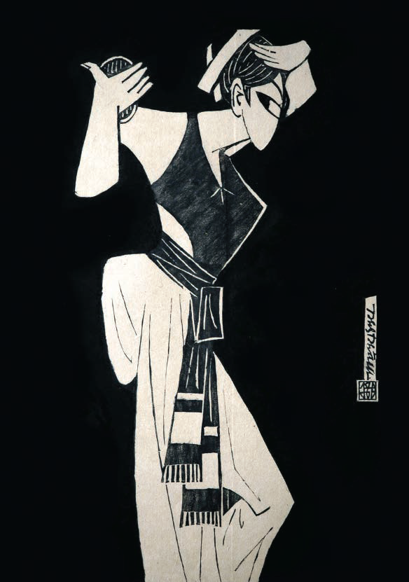 Again and again, he marinates a theme in his creative juices. The hair-washing theme features in Que moi (New Homeland). This woodblock, not illustrated, shows a village in moonlight. Behind houses and a bamboo fence, standing at some distance in the shadows but caught in the moonlight, a naked woman bends over a basin washing her long hair besides a stoneware water jar—an incidental presence occupying only the right-hand corner of the composition. However, in Ben sau buc rem (Behind the Screen) (3) and another titled Goi dau (Washing Hair), the latter with decidedly Japanese influence, the woman’s figure commands all the space on the woodblock, the surrounds enriched with strong linear detail. This subject would later be reworked in lacquer in black and gold, also under the title, Goi dau (Washing Hair).