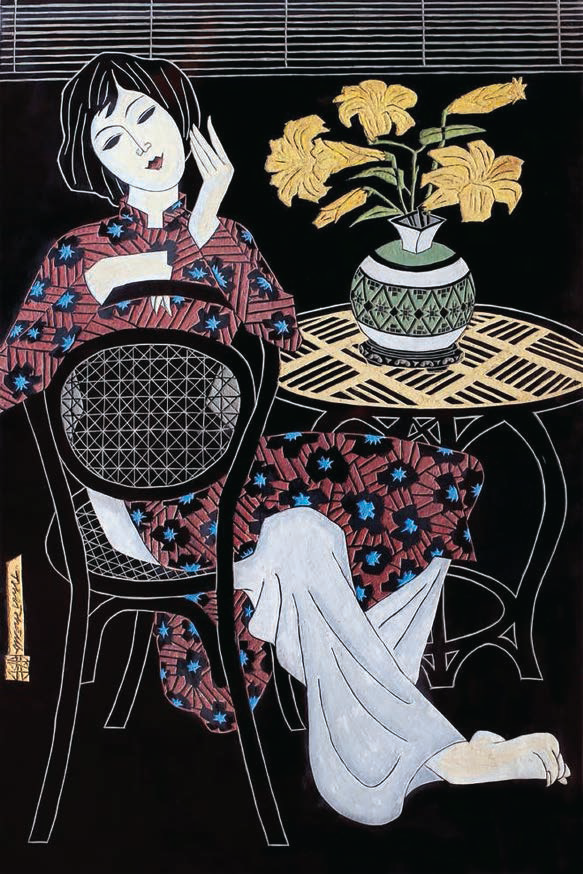 Pham’s strengths are all on view in his work featuring city girls. There is a riot of textures and patterns in a rich decorative vocabulary that extends across clothing, tabletops, tablecloths, vases, blinds and chairs. Wearing ao dai or fashionable pants and blouse, upswept hair, or chic-cut short styles, and with long slender hands and manicured nails, these girls dominate. They sit on high-backed chairs, they ponder, they fuss, they dry and comb their hair. With self-conscious poise, they lean across a table, arrange a lily in a vase. They flaunt themselves, sometimes most provocatively (5–8). In Trang diem (Make-up), against a black background, a coquettish fashionista flirts at her image in a hand-held mirror (5). When asked about the remarkable bevy of women portrayed, Pham states that fantasy is his model rather than any actual woman, but if they are fantasy some bear an uncanny resemblance to his wife, in both stature and profile. He says he particularly enjoys working on this theme and it might be said it is the only theme of his mature years that dallies on the gentler side of life.