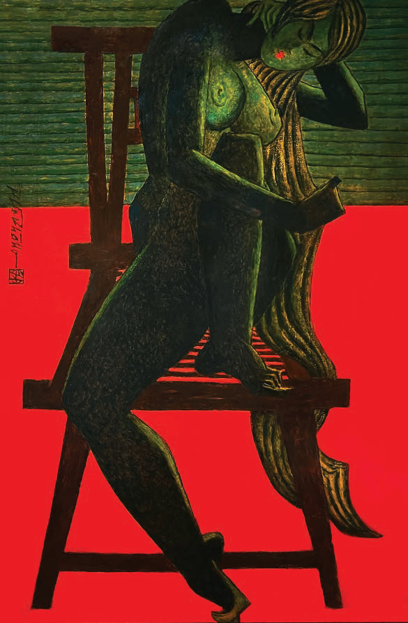 His skilled draughtsmanship is evident in his use of space, the employment of strong lines, extensive patterning and the use of contrasts. He reserves black and white for woodblock prints, which he says is in his blood, as seen in the Phan Boi Chau woodblock and in Spring Garden (13). Later, when he worked in lacquer, he exploited the impact of the colours, favouring warm reds and yellows against dark colours though sometimes also combining colour with black and white (11). Alongside his accomplished black and whites (2–6, 9, 12, 13), Pham’s facility with colour is unquestioningly engaging (7, 8). Subsequently, as in a 2013 lacquer work titled Chai toc (Combing Hair), there is an emboldened use of colour: against a blindingly red background modesty cast aside is depicted on a wooden chair in a smouldering dark green touched with gold (10). It is this judicious use of a limited colour palette that imbues Pham’s compositions with a singular vigour and freshness (10, 11, 14–19); consider the poke of red on the lips (10, 14, 15).