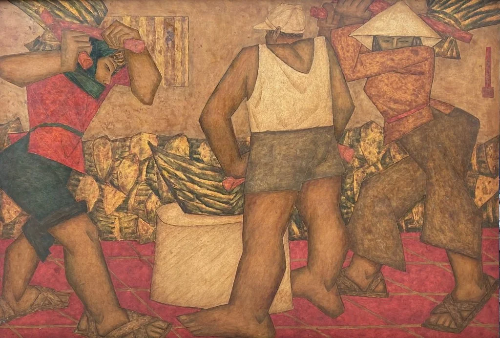 In 1955–1956, employment took him to Ha Tay province, teaching graphic art as part of the education reform programme, but in his free time he bundled up his artworks and pedalled to Hanoi to show them to the artists, Sy Ngoc (1919–1990) and Diep Minh Chau (1919–circa 2003), both teaching at the newly reopened art school in Hanoi. Pham was anxious to know how his own paintings measured against those of their students. He states that Nguyen Phan Chanh (1892–1984), Tran Van Can (1910–1994) and Thang Tran Phenh (1895–?) were all early artistic influences. However, his knowledge of graphic arts had a strong influence while his later encounter with cubism also struck a chord, and it is the combination of these influences that has brought great vitality to his work. Yet, there is also a Japanese influence evident in the depiction of certain facial features and hairstyles. Interestingly, influence of social realism is confined to depictions of the country’s workers, as described below. Pham says his aim has been to create works that are easily understood and visually impactful. Poetic, curvaceous lines and ephemeral soft colours are anathema to him.